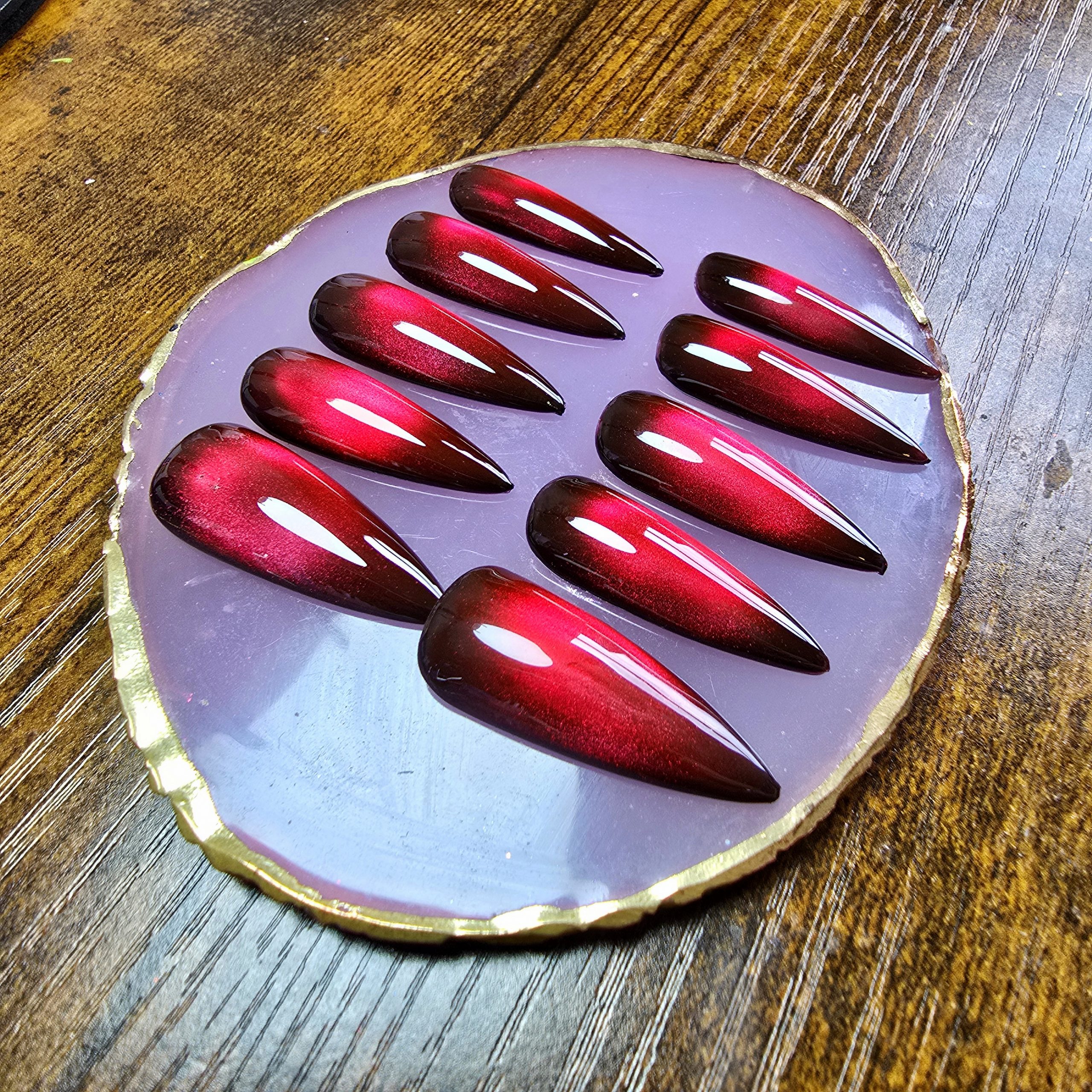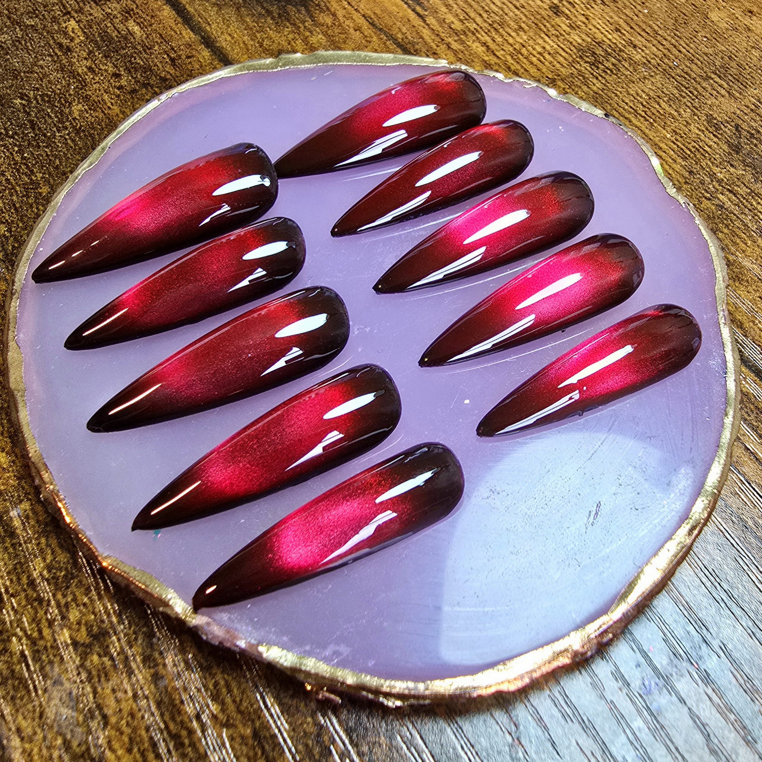 Embrace your mysterious side with these stunning deep red cat eye nails. Each set of 10 comes complete with a manicure kit for a flawless finish.