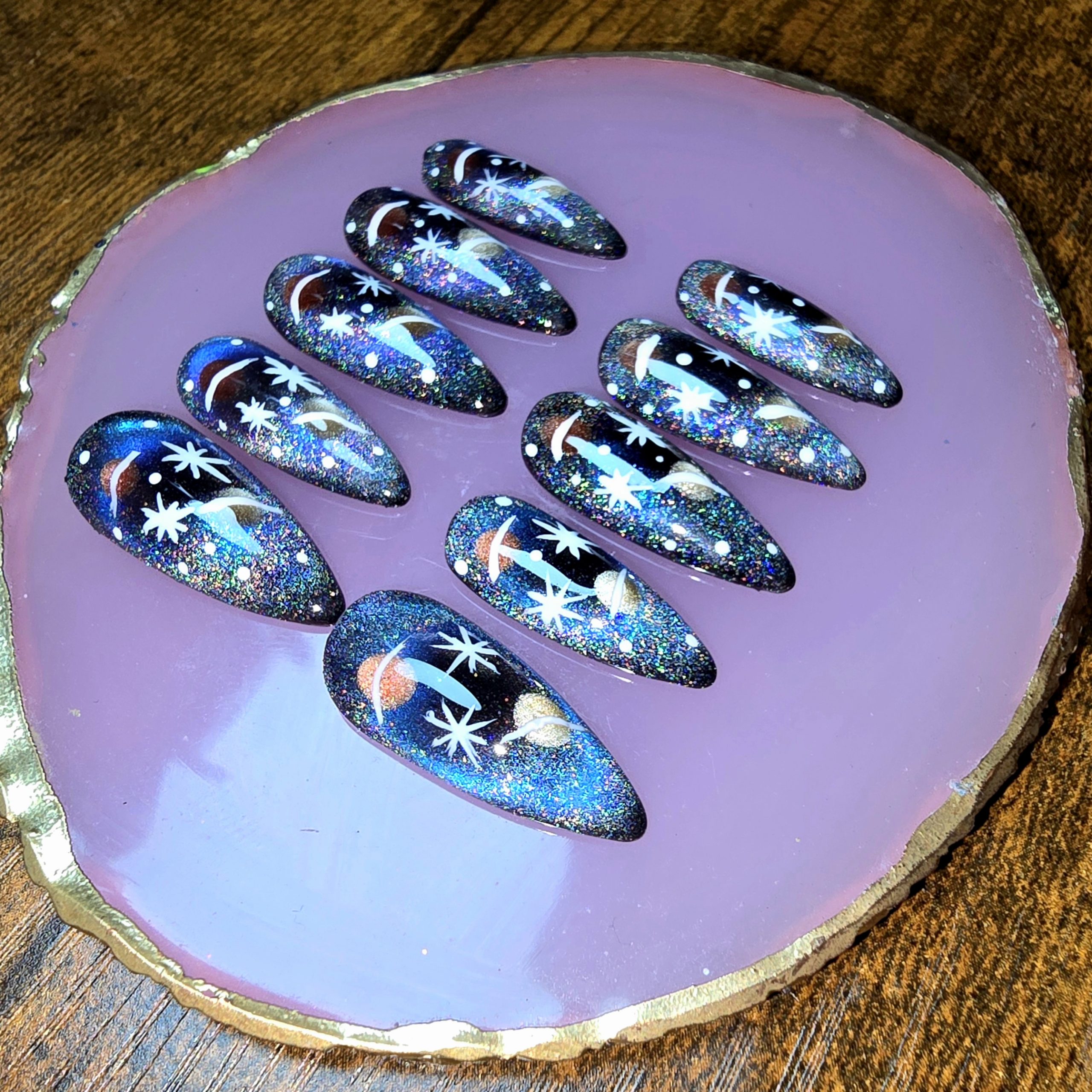 Blast off in style with a dazzling space-themed nail set, complete with 10 cosmic nails and a handy manicure kit.