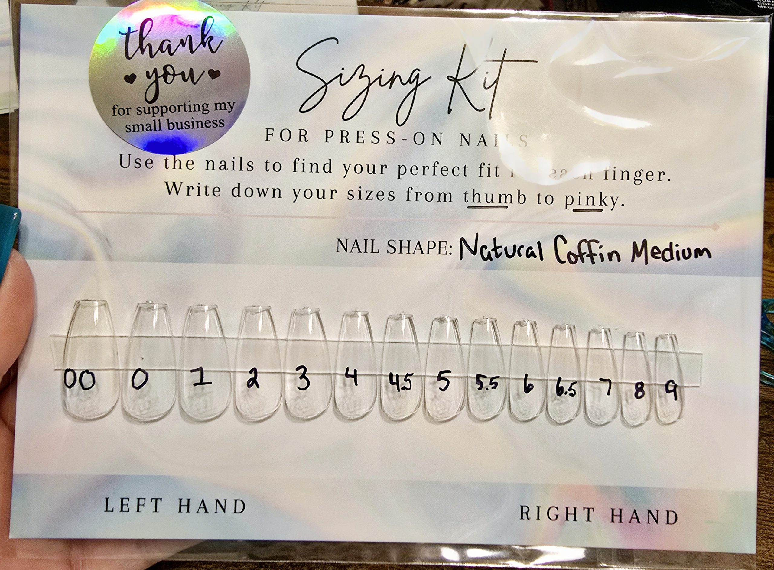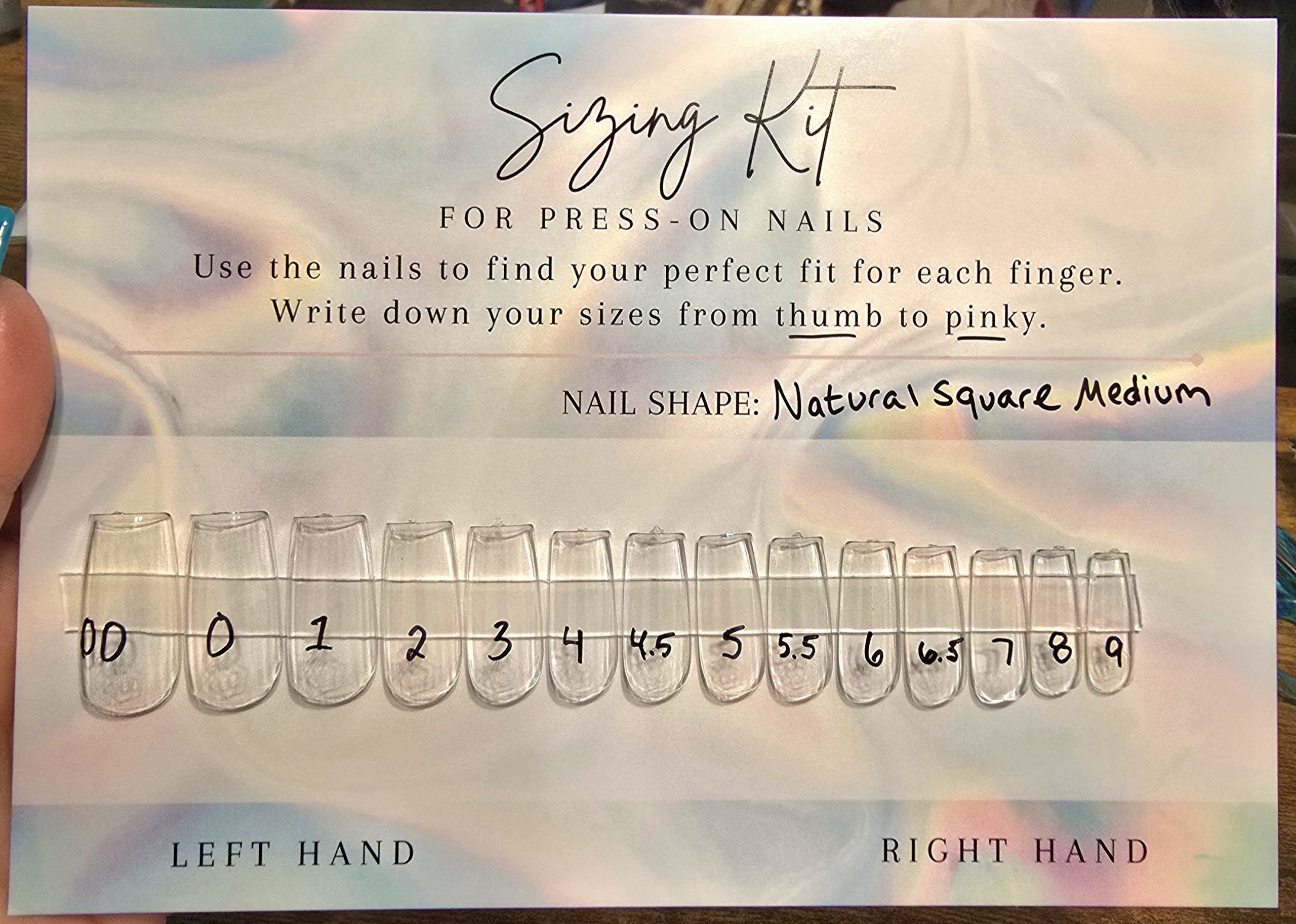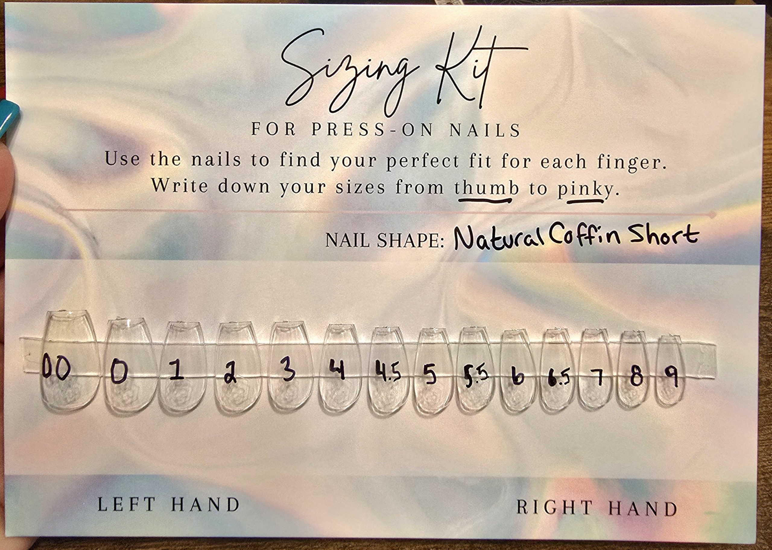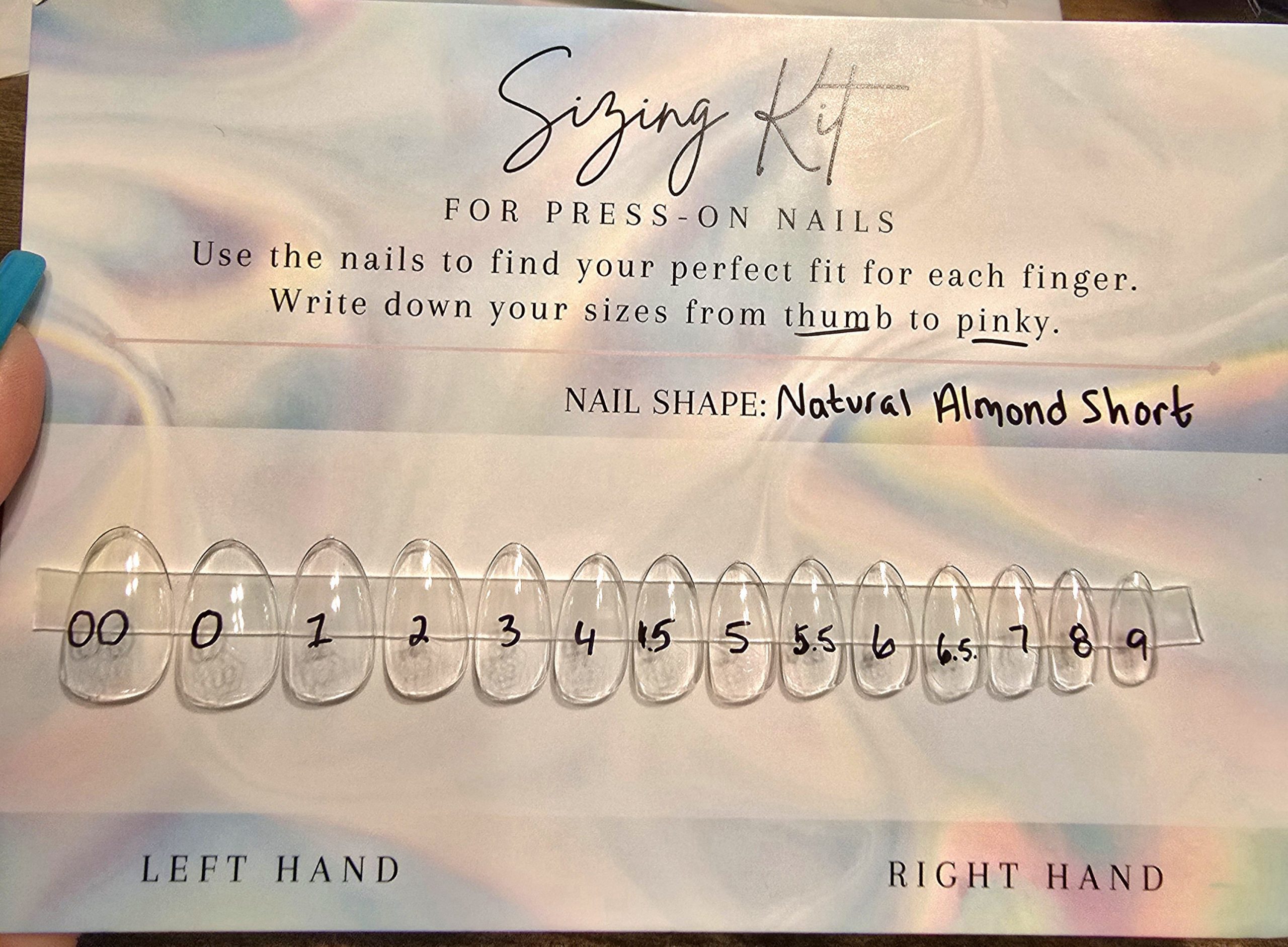 A sizing kit is the best way to get your perfect fit! Pick your shape and length and all 14 sizes will be sent for you to. Fit each finger from thumb to pinky and write down the corresponding number (example: 3, 5, 4, 6.5, 7).